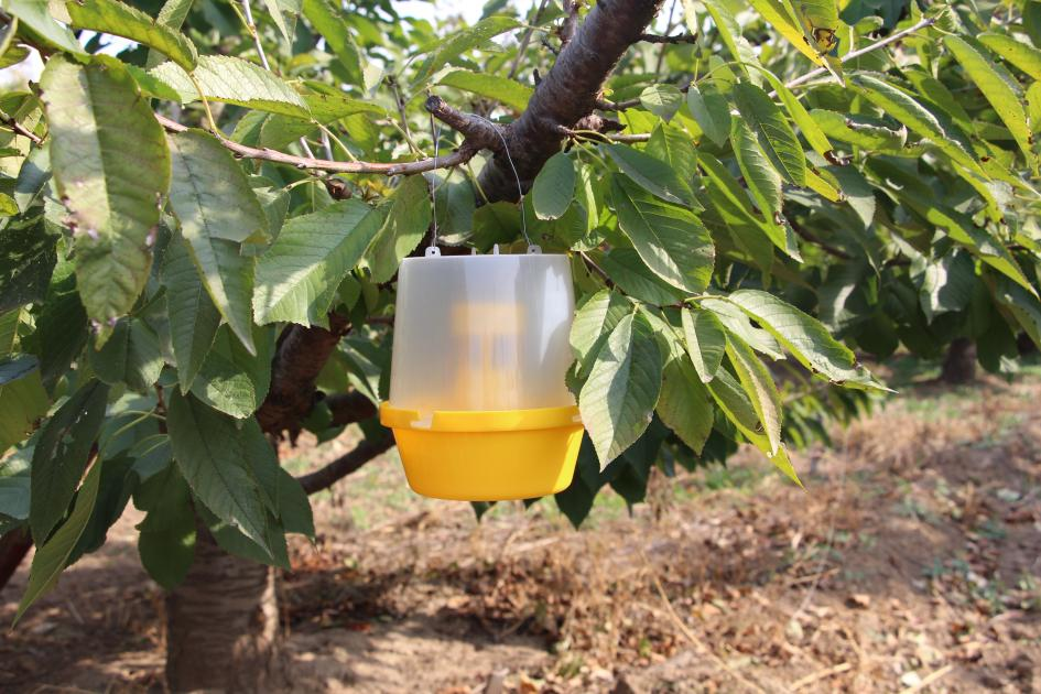 3、用铁丝将诱捕器悬挂于树木背阴处的树枝上,悬挂位置为树冠的中下部。