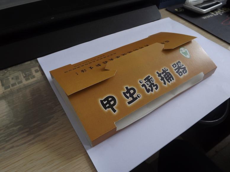 3、将安装好的诱捕器置于避光处,可以平放在干净的平台上,也可以通过顶部的小孔悬挂在离地面1~2m的墙壁上。
